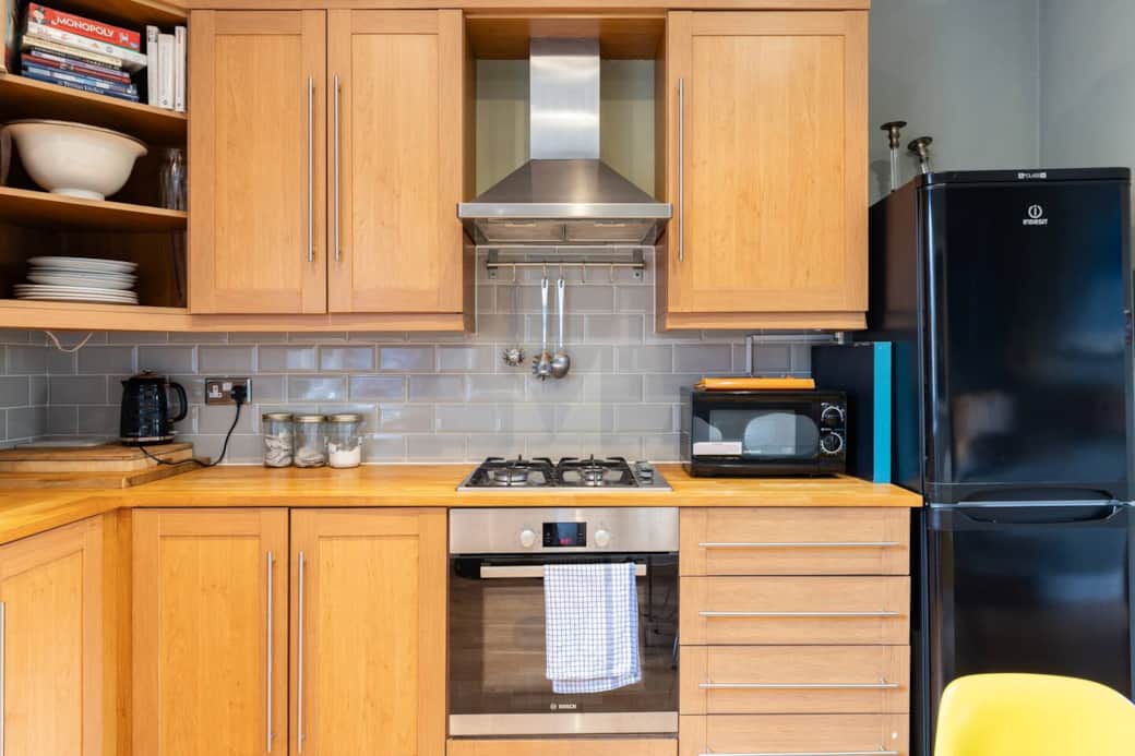 Children's high chair, Coffee machine, Cooking utensils, Dishwasher, Kitchen stove, Kitchenette, Microwave, Oven, Refrigerator